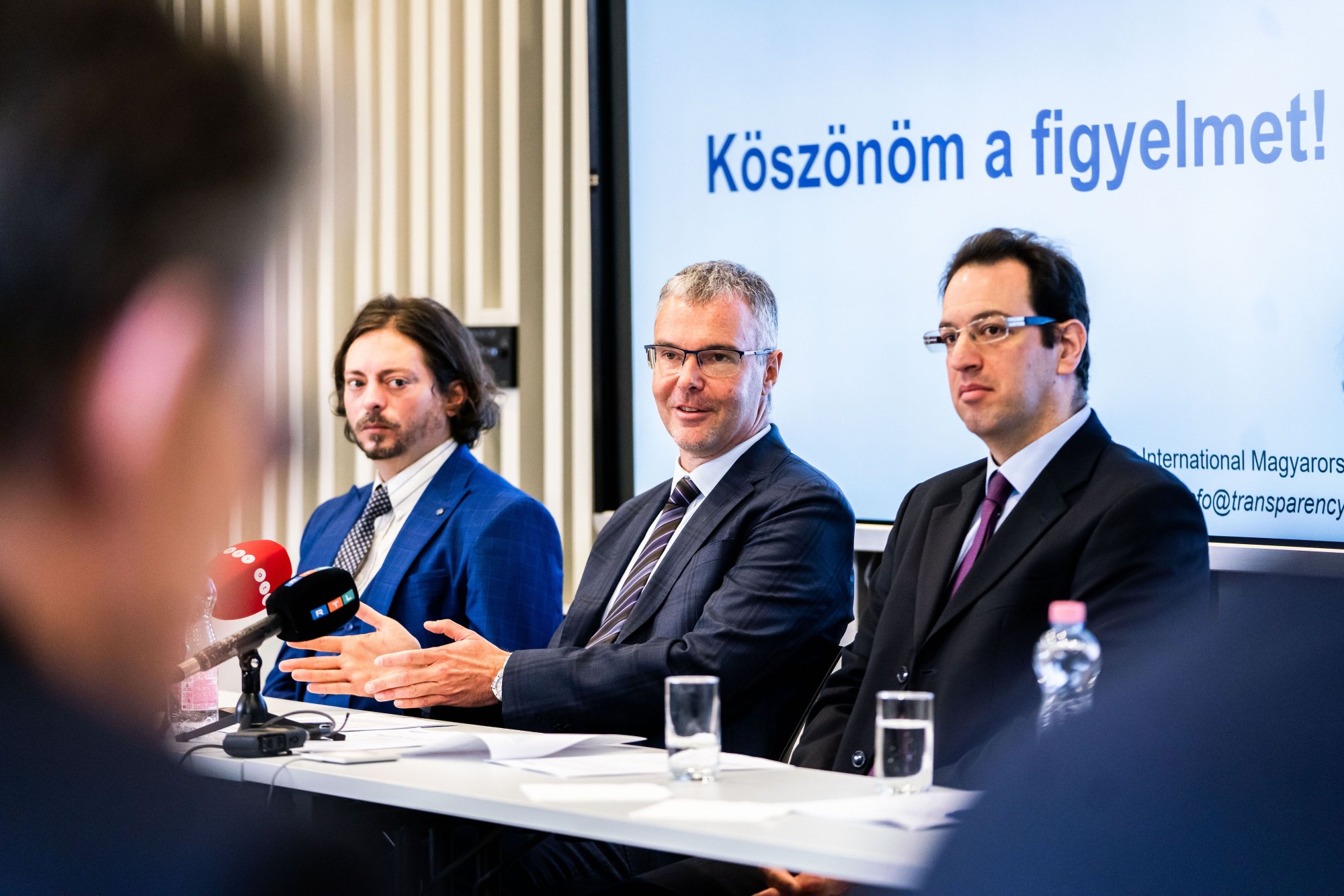 2023.01.31. A TI Magyarország munkatársai, Jávor Marcell Dénes kommunikációs menedzser, Martin József Péter ügyvezető igazgató és Ligeti Miklós jogi igazgató a Korrupció Érzékelési Index eredményeinek, és a TI Magyarország éves korrupciós jelentésének bemutatóján fotó: Pelikán János, Képszerkesztőség